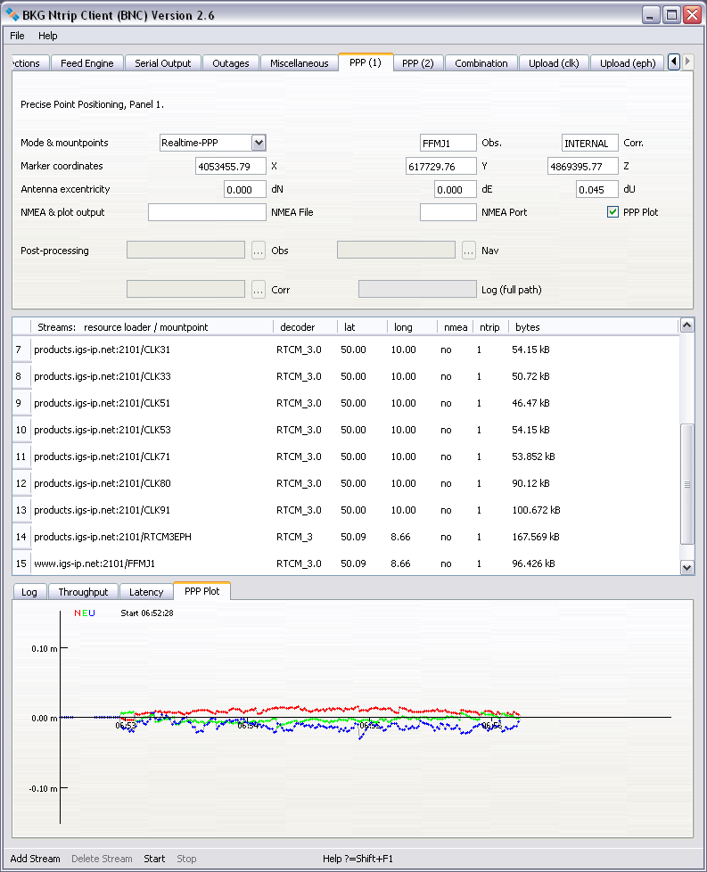 Records of BNC's activities are shown in the 'Log' tab. The bandwidth consumption per stream, the latency of incoming observations and a PPP time series for coordinates are shown in the 'Throughput', 'Latency' and 'PPP Plot' tabs of the main window.As a default, configuration files for running BNC on Unix/Linux/Mac systems are saved in directory '${HOME}/.config/BKG'. On Windows systems, they are typically saved in directory 'C:/Documents and Settings/Username/.config/BKG'. The default configuration file name is 'BNC.ini'.