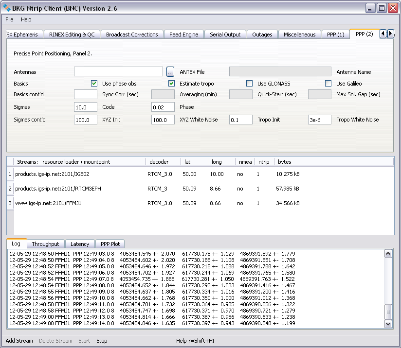 Records of BNC's activities are shown in the 'Log' tab. The bandwidth consumption per stream, the latency of incoming observations and a PPP time series for coordinates are shown in the 'Throughput', 'Latency' and 'PPP Plot' tabs of the main window.As a default, configuration files for running BNC on Unix/Linux/Mac systems are saved in directory '${HOME}/.config/BKG'. On Windows systems, they are typically saved in directory 'C:/Documents and Settings/Username/.config/BKG'. The default configuration file name is 'BNC.bnc'.