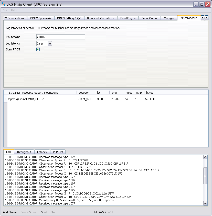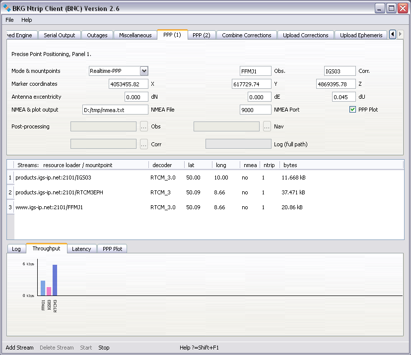 Records of BNC's activities are shown in the 'Log' tab. The bandwidth consumption per stream, the latency of incoming observations and a PPP time series for coordinates are shown in the 'Throughput', 'Latency' and 'PPP Plot' tabs of the main window.As a default, configuration files for running BNC on Unix/Linux/Mac systems are saved in directory '${HOME}/.config/BKG'. On Windows systems, they are typically saved in directory 'C:/Documents and Settings/Username/.config/BKG'. The default configuration file name is 'BNC.bnc'.