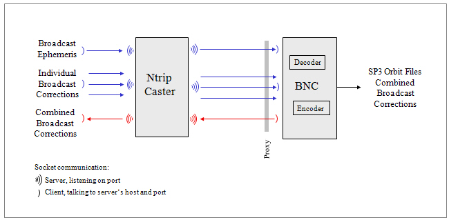 Figure 3: Flowchart, BNC feeding a real-time GNSS engine and uploading encoded Broadcast Corrections.