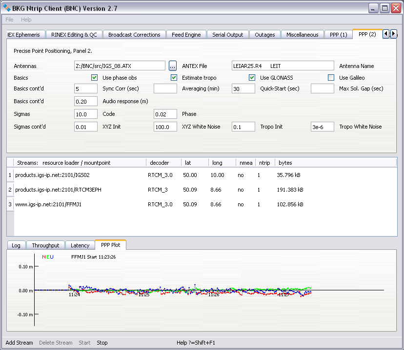 Records of BNC's activities are shown in the 'Log' tab. The bandwidth consumption per stream, the latency of incoming observations and a PPP time series for coordinates are shown in the 'Throughput', 'Latency' and 'PPP Plot' tabs of the main window.As a default, configuration files for running BNC on Unix/Linux/Mac OS X systems are saved in directory '${HOME}/.config/BKG'. On Windows systems, they are typically saved in directory 'C:/Documents and Settings/Username/.config/BKG'. The default configuration file name is 'BNC.bnc'.